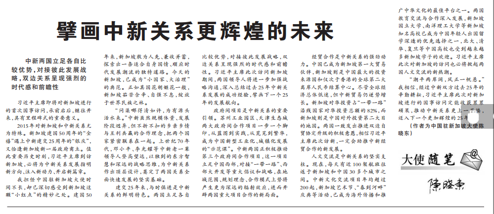 《人民日报》刊登曾任新加坡大使陈晓东大使题为《擎画中新关系更辉煌的未来》的署名文章:“新加坡建国50多年来,新加坡敢为人先、兼收并蓄,探索出一条适合自身国情、顺应时代发展潮流的独特道路。今天的新加坡,已成为“小国家、大治理”的典范。正如其国花胡姬花一般,新加坡茹若含辛、自强不息,绽放于世界民族之林”。