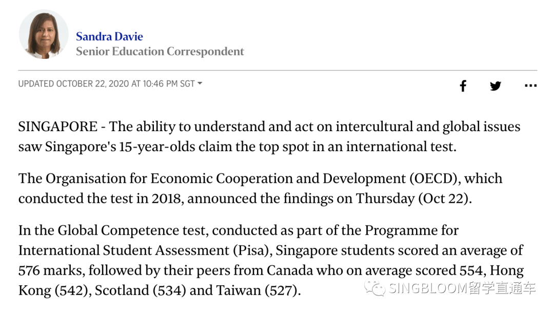 在经济合作与发展组织(OECD)进行的国际学生评估计划(PISA)测试中,新加坡连续多年被评为表现最佳的地区。